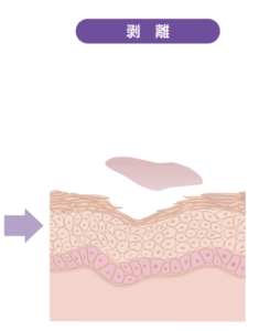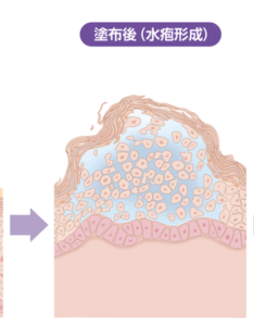 中性セリンプロテアーゼの活性化を介して、表皮のデスモソームを脆弱化し、表皮構造を破壊することで、塗布部位に水疱を形成します。