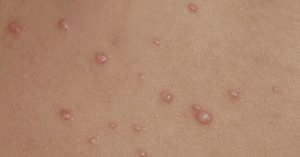 水いぼは、直径1~4mmの小さな肌色の丘疹及び小水疱性丘疹を形成し、外見が水様光沢を帯びてみえることから俗に“みずいぼ”と呼ばれ、四肢や体幹に多発します。