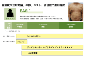 重症度や注射間隔、年齢、コスト、合併症で薬剤を選択していきます。